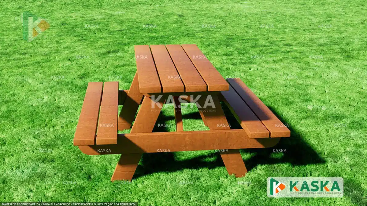 A Mesa Picnic é fabricada em madeira de reflorestamento, tratada em autoclave. Banco fixo dos dois lados da mesa, para até 6 crianças no total.